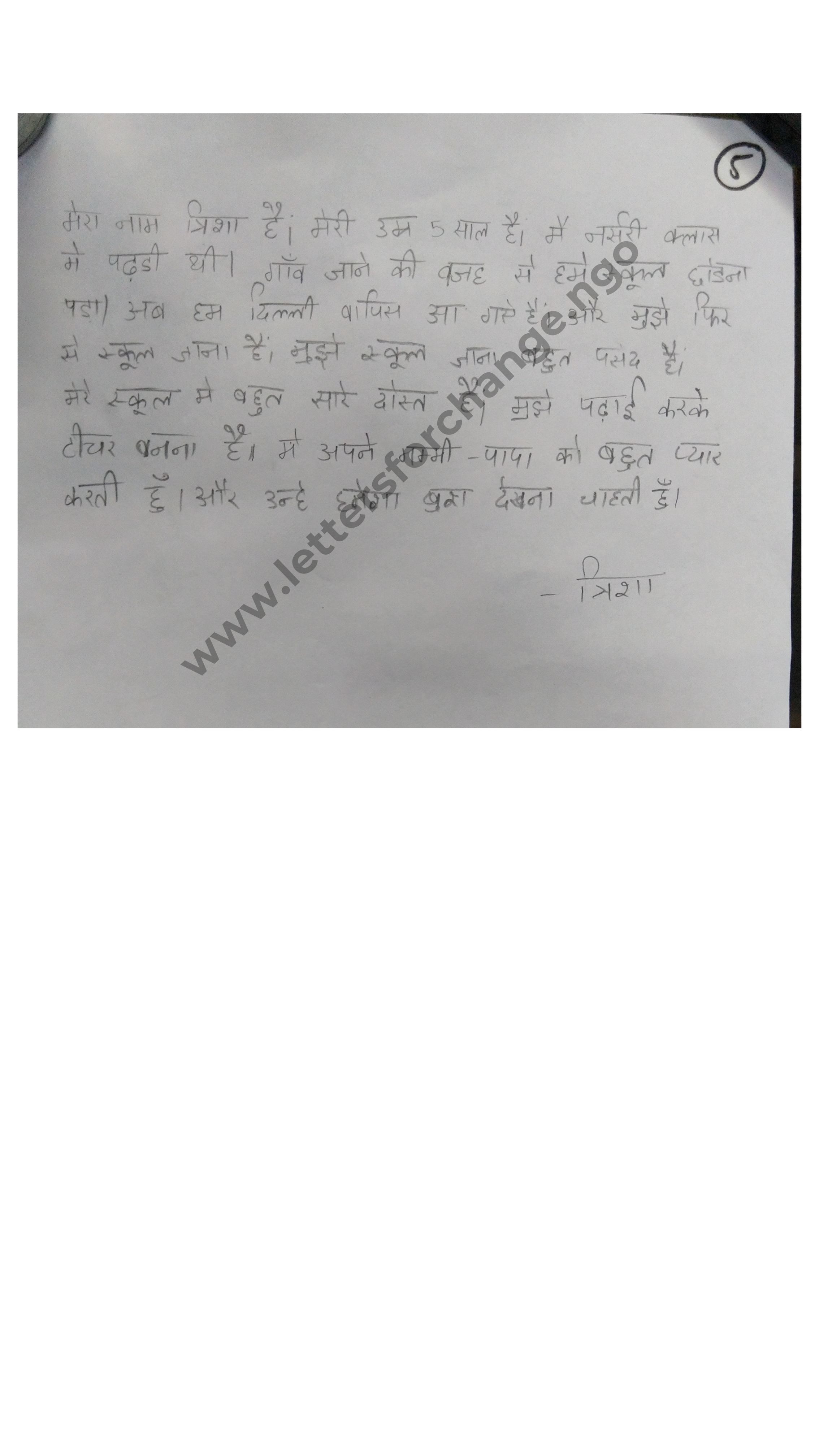 Trisha, a 5-year-old, shares her heartfelt journey in a short letter. She had to leave nursery school due to a move to the village but is now back in Delhi and eager to return to school. Trisha loves going to school, cherishing her many friends there. Her dream is to become a teacher, and she adores her parents, wishing to always see them happy. This letter reflects a young girl’s enthusiasm and dreams.